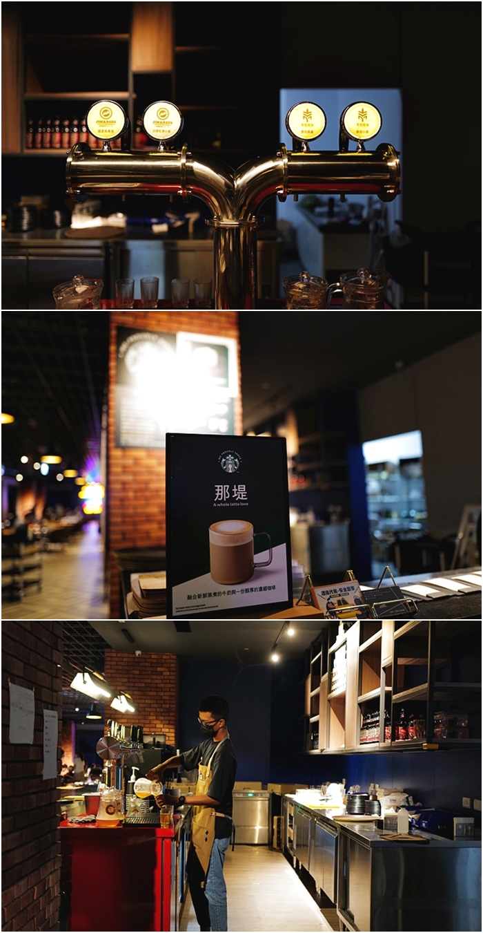 | 最特別的是美式餐廳內還有提供宜蘭在地知名的精釀啤酒,另外還有掛上星巴克的招牌,我以為星巴克有進駐,聽工作人員解釋,餐廳內咖啡豆都是跟星巴克採購的,也遵照星巴客的sop流程,所以煮出來的味道都跟星巴克一模一樣,比較像授權的概念。 |