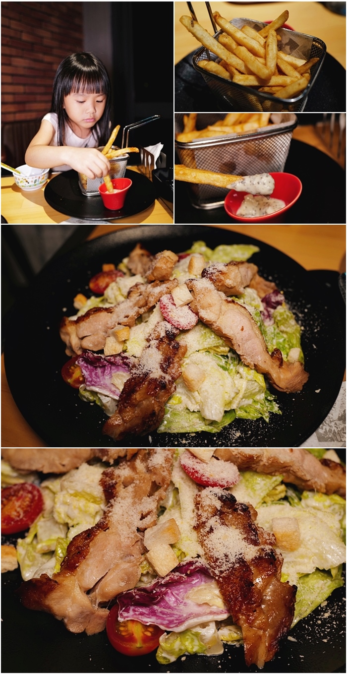 | 另外還點了松露薯條$130,松露醬超好吃,我女兒一整個停不下來,就連雞肉凱薩沙拉$230 的份量也超足,整體上幾乎沒有地雷,一整個飽到天靈蓋。 |