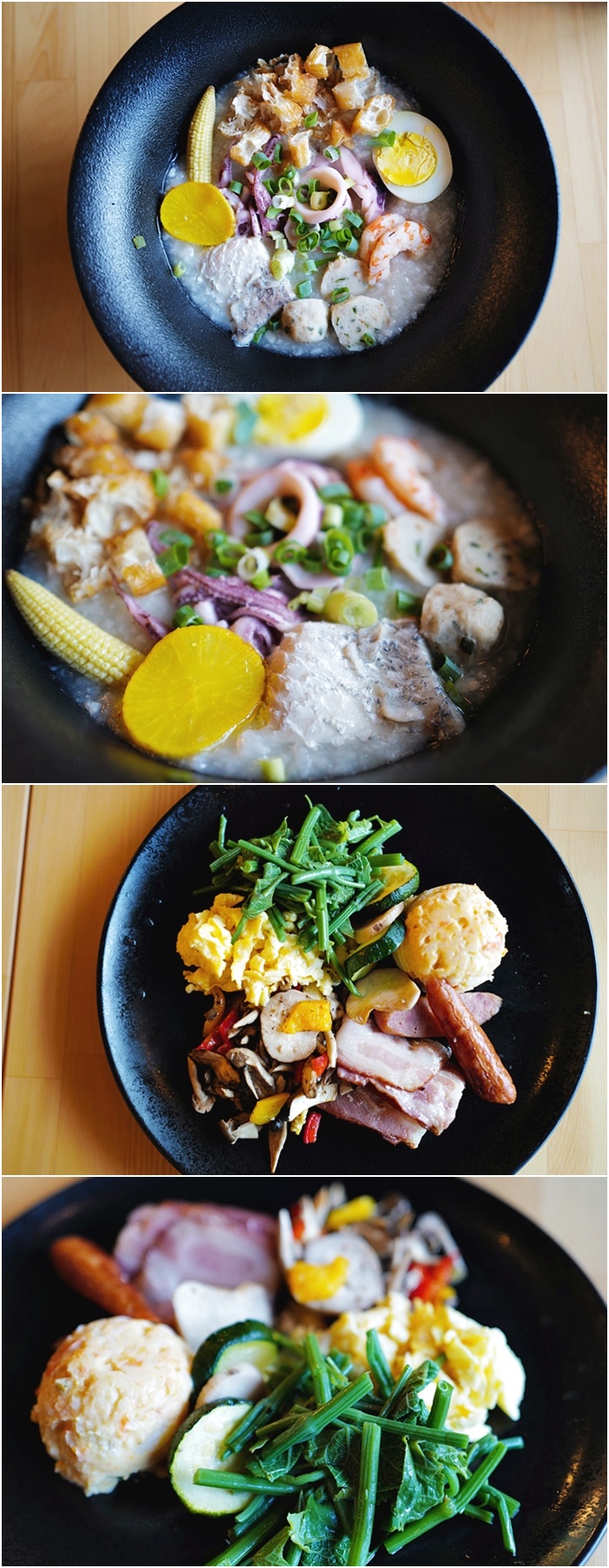| 早餐主食分為西式跟中式,中式是海鮮粥,海鮮料給的很多,女生絕對能吃飽,男生吃不飽還可以去自助吧拿麵包跟沙拉等來填肚子,西式餐點就是炒蛋、時蔬、培根熱狗炒菇等,算是還滿豐富的餐點。 |