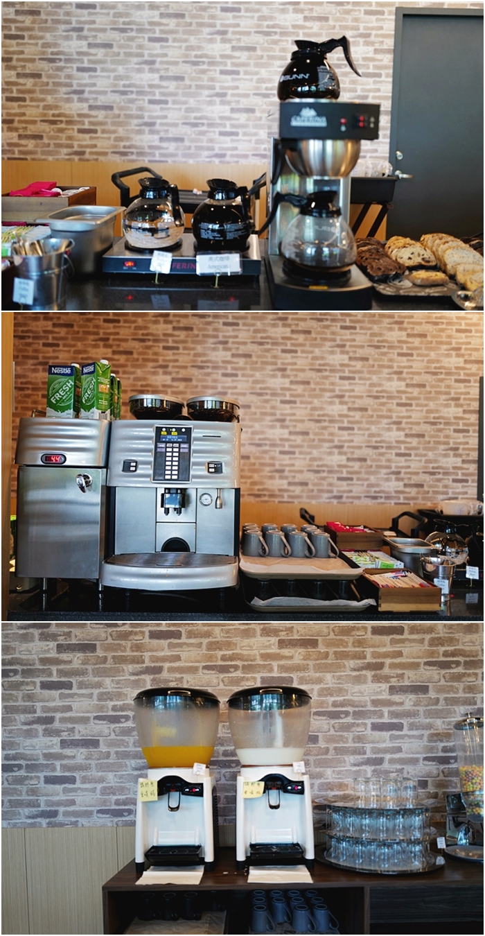 一旁的自助吧飲料算是很齊全,果汁豆漿,咖啡機或是美式咖啡、熱茶應有盡有。