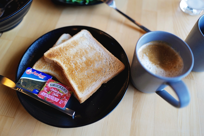 | 吃完主食後,再搭配兩片吐司跟一杯熱拿鐵,慢慢優閒的享受這餐時光。 |