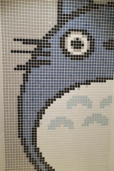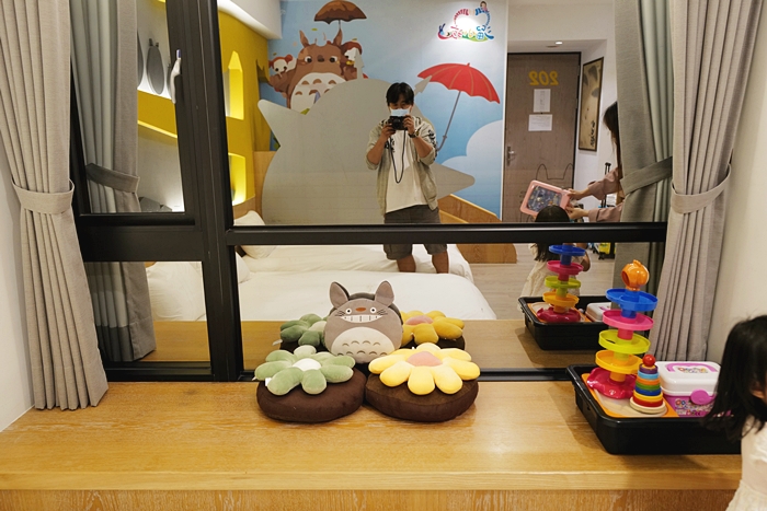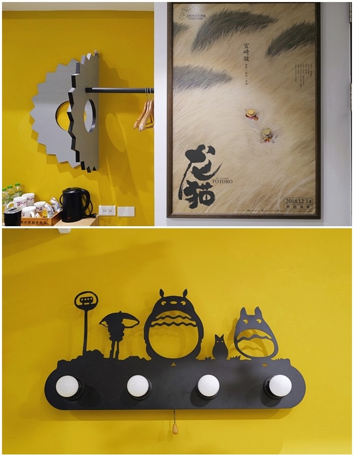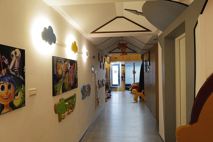 | 通往電梯及後方的走道上也掛滿很多動畫拼圖,牆壁也設置了很多遊具,順帶一提溜小孩民素有電梯,這個很加分,我住過很多親子民宿,幾乎都只有新的透天才會有電梯,不然搬著行李走到三四樓超累。 |