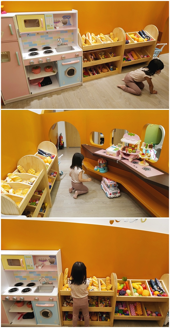 | 裡面是我女兒最喜歡的扮家家酒小廚房,還有超多食材可以供給小朋友煮飯,還有收銀機可以對著窗口販售,我女兒很喜歡呢 |