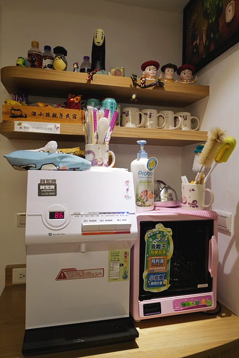 | 旁邊有冷熱開飲機,放置在架上的零食飲料都可以取用,但記得不要帶走唷,這邊還有消毒櫃,有帶小嬰兒的家長奶瓶也不用擔心沒地方消毒。 |