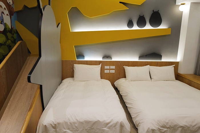 | 龍貓房是溜滑梯房,一張雙人床一張單人床,看來民宿主人很懂得老公通常都會被趕到另一張床睡的慘況,床頭旁有插頭跟電燈開關。 |