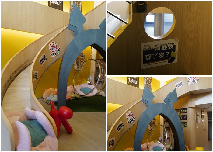 | 很多人都是衝著這兩層樓高的木造溜滑梯來的,小朋友直接從挑高二樓的高度滑下來非常開心,不過滑這溜滑梯錢需要先著裝民宿準備的青蛙裝。 |