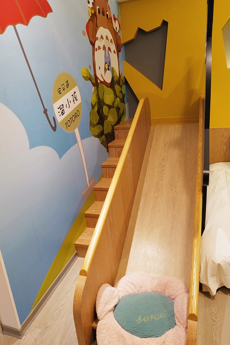 | 房間一邊還有溜滑梯,牆壁也都有彩繪,營造出繽紛活潑的感覺,房間內就可以讓小朋友盡情溜滑梯,大人盡情在床上放空。 |