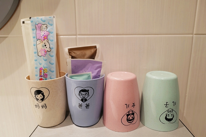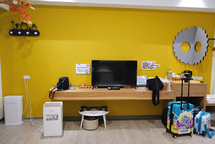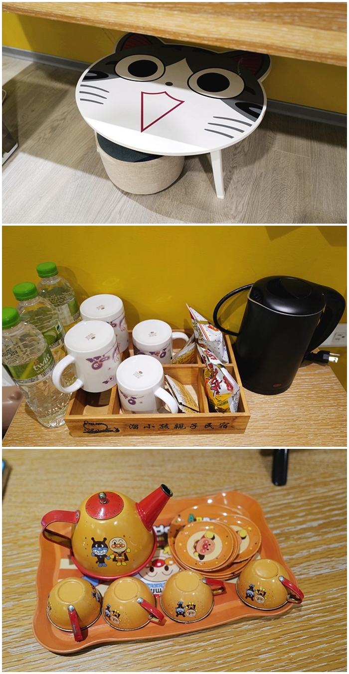 | 房內有礦泉水跟店熱水壺,茶包跟咖啡包也都應有盡有,另外還有一整套小朋友的茶具組,是麵包超人的唷,很可愛。 |