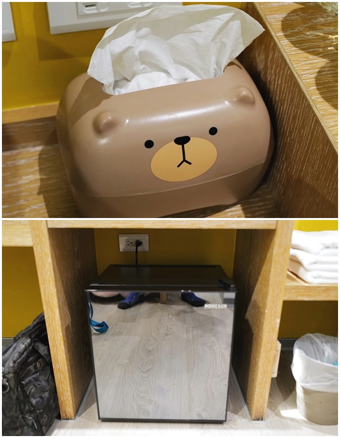 | 連面紙盒也都是小熊造型,滿滿的童趣,冰箱是滿漂亮的鏡面小冰箱。 |