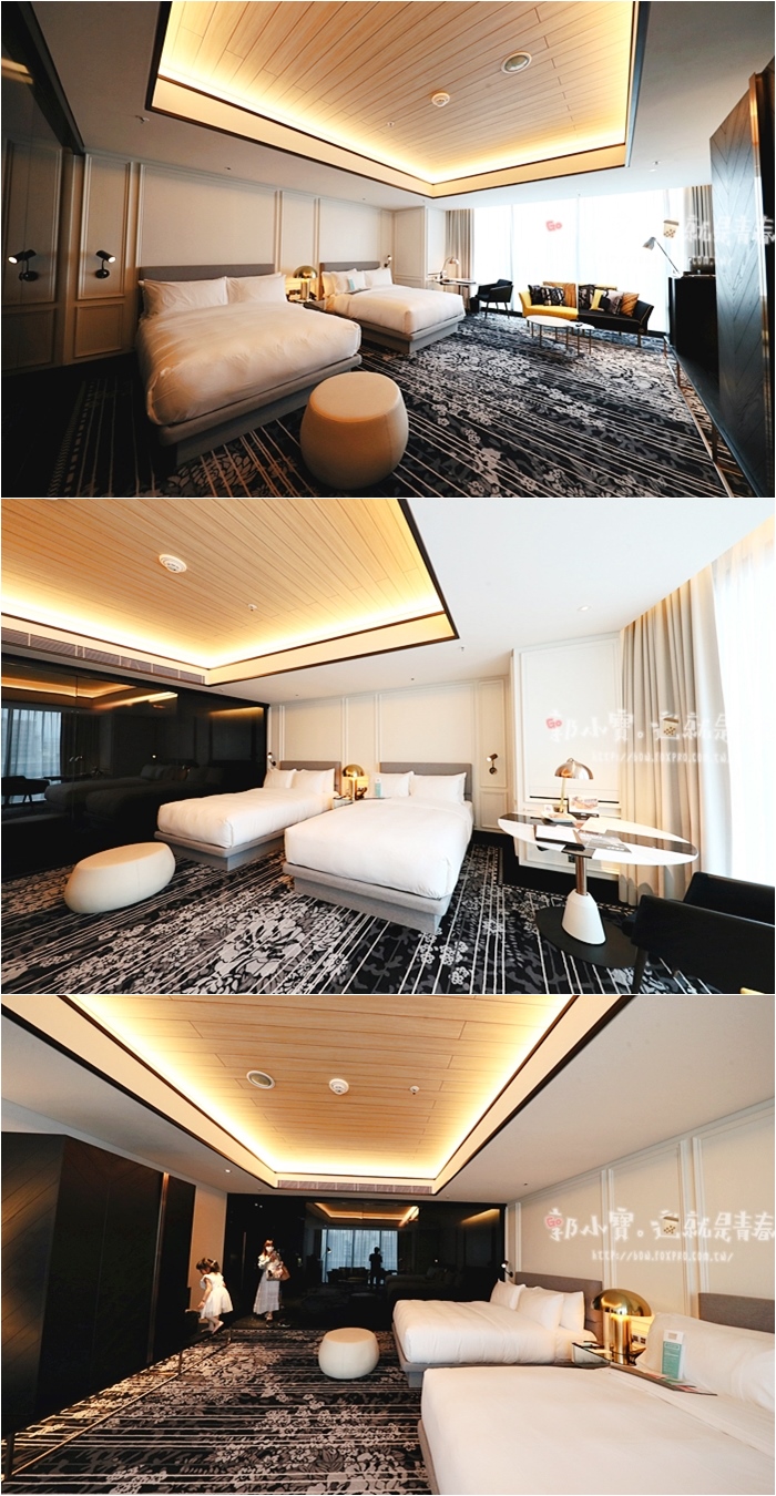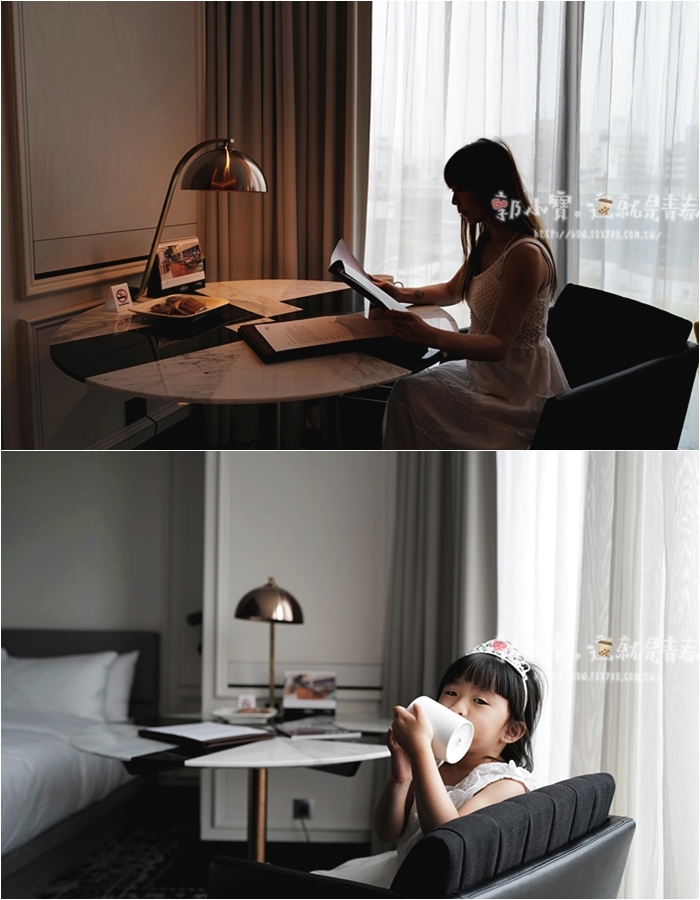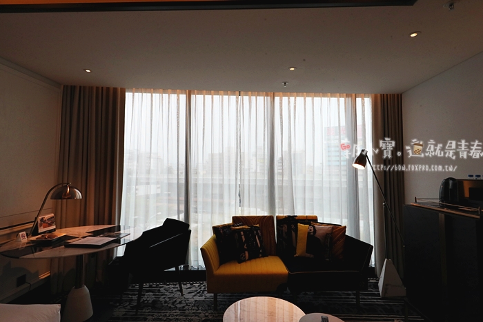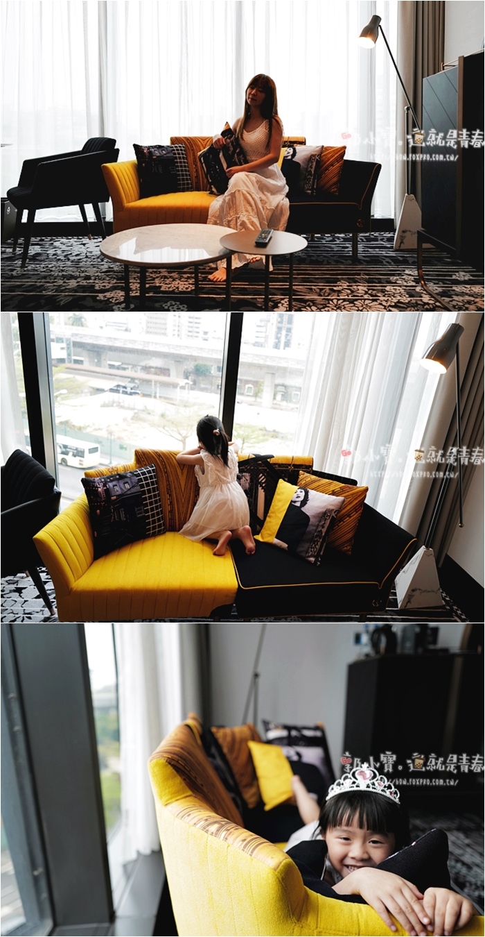 | 雙色拼布沙發我們也很喜歡,讓整體的空間跳出來一點活潑感,大面積的落地窗除了讓採光滿分以外,窗外就可以眺望台中市景,李方艾美斜對面就是台中火車站,雖然飯店已經努力補強了,但是低樓層的房間還是免不了聽到火車進出站的聲響,如果一點點聲音都無法入睡的人,建議入住前往高樓層前進! |