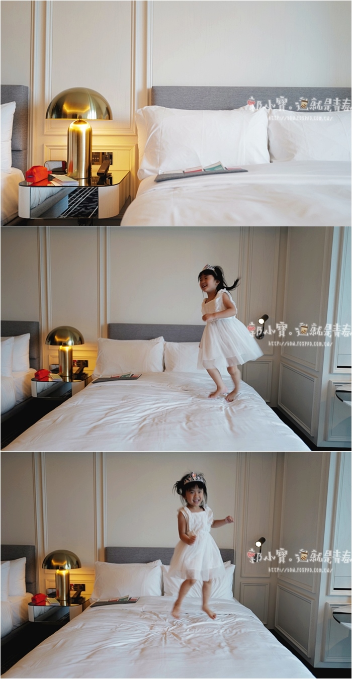 | 我們訂的四人房,房內提供的是兩張標準雙人床,床頭櫃皆有各種插頭跟USB接頭,不免俗當然要派我們家的跳床小當家去跳一下床墊的感覺,睡起來的感覺相當不錯,感覺獨立彈簧床上又加了一層滿厚的舒適層,睡起來四平八穩,隔天也不會腰酸背痛。 |