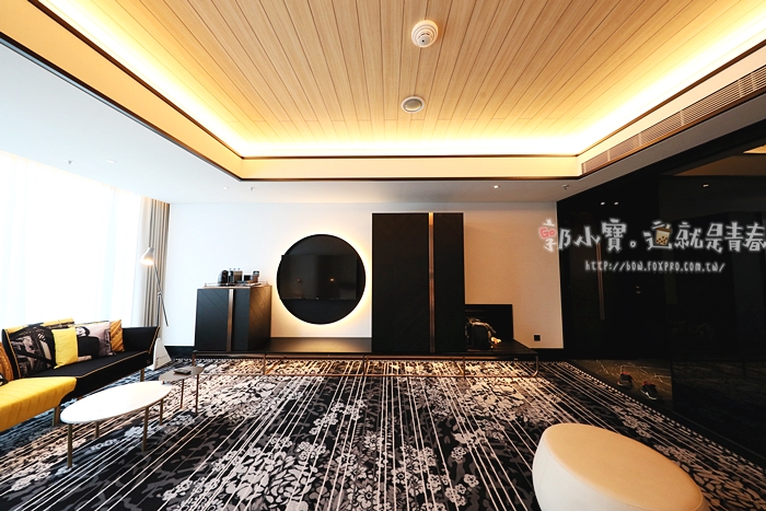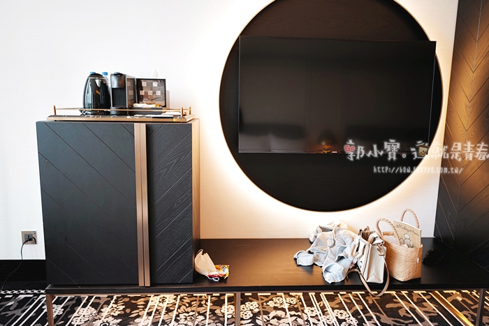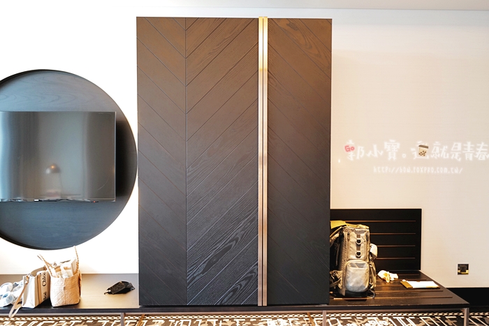 | 床的正對面就是衣櫃、茶水櫃跟電視,李方艾美的設計師我只能說他真的很用心,不仔細看還沒發現那大黑圓裡面就是電視,正常電視的長方造型掛在牆上都還滿突兀的,但是設計師花一個圓。方圓之間的意象很不錯。 |