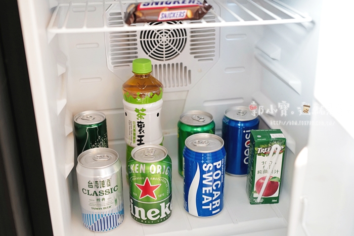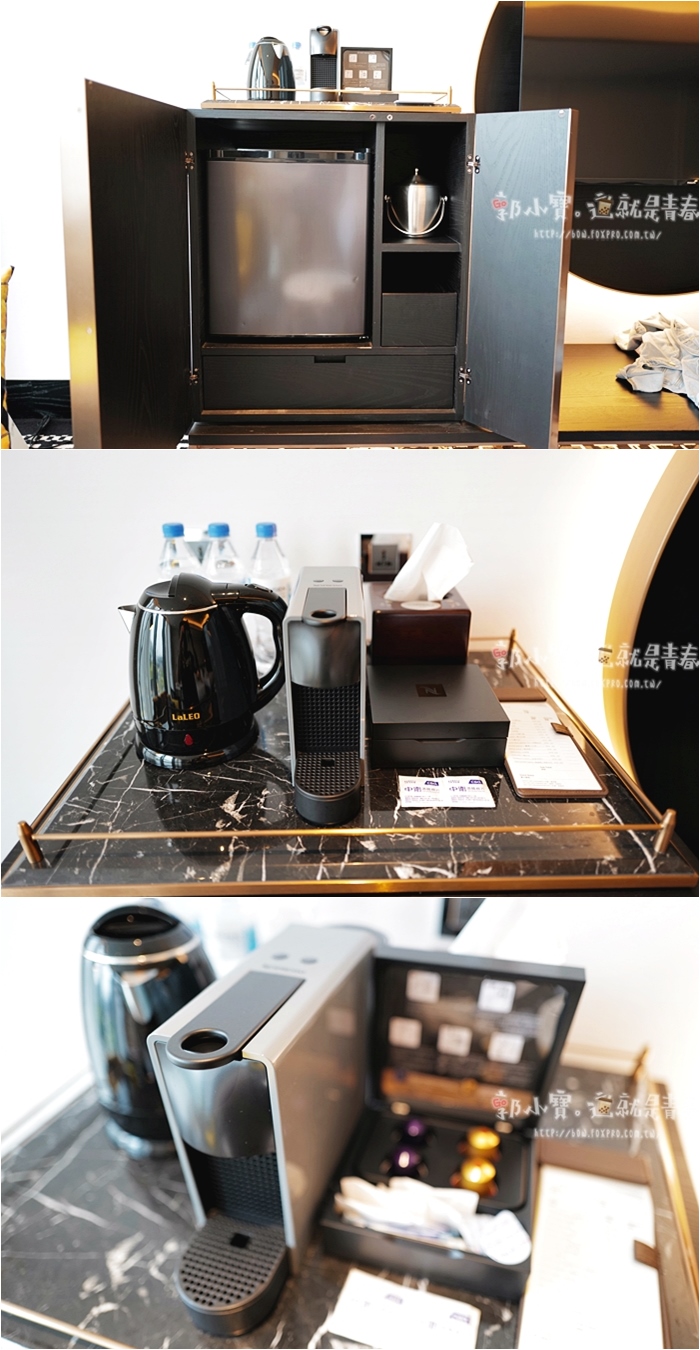 | 茶水櫃打開門後可以看到冰箱跟茶杯、冰桶等器皿,桌面上則是放著電熱水壺跟咖啡機,附上四個咖啡膠囊,咖啡膠囊跟茶包都是可以免費飲用。 |