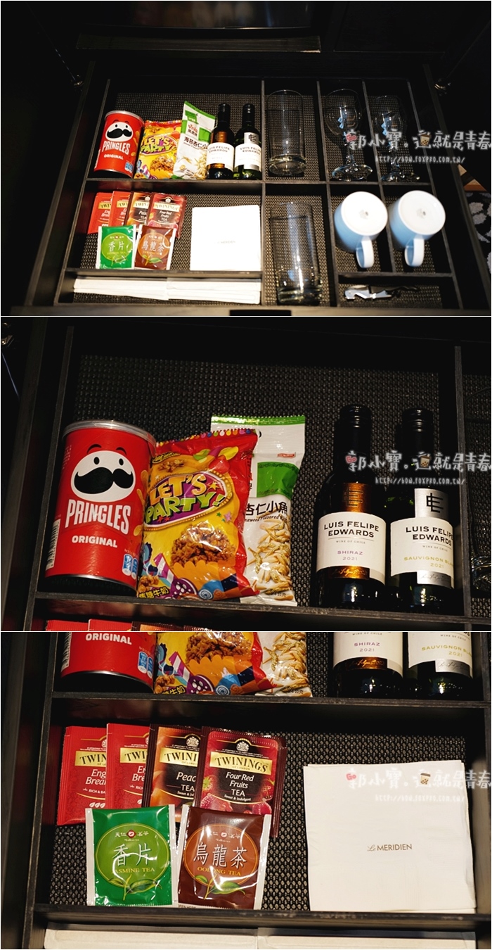| 茶櫃的抽屜拉開後,除了茶包以外,其它通通是要付費的,零食千萬別拆了就吃,酒杯也擦拭的超亮。 |