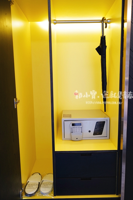 | 衣物櫃打開後除了一個電子保險箱以外,雨傘跟拖鞋也都放在這邊,拖鞋我覺得SOSO,本以為五星飯店的拖鞋都應該要很厚。 |
