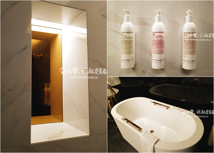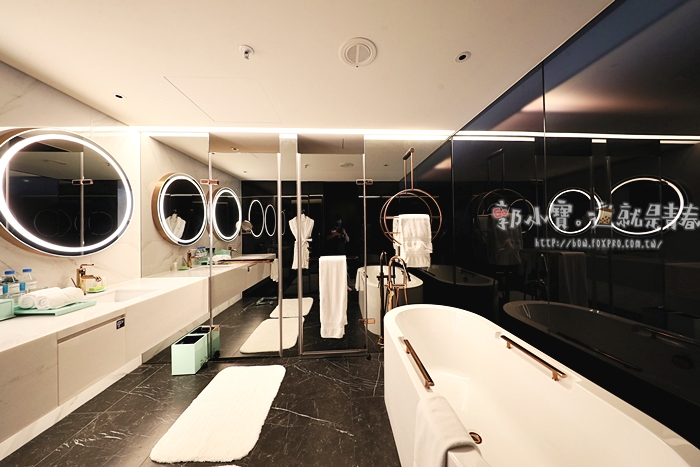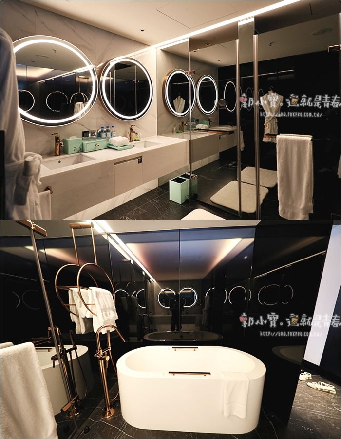 | 浴廁空間也很讚,拉開門後看到這浴廁忍不住說這也太美了,拼接的燈條讓光線非常柔和,走進去就覺得整個人相當的放鬆,且李方艾美酒店好多小設計都喜歡用圓的造型。 |