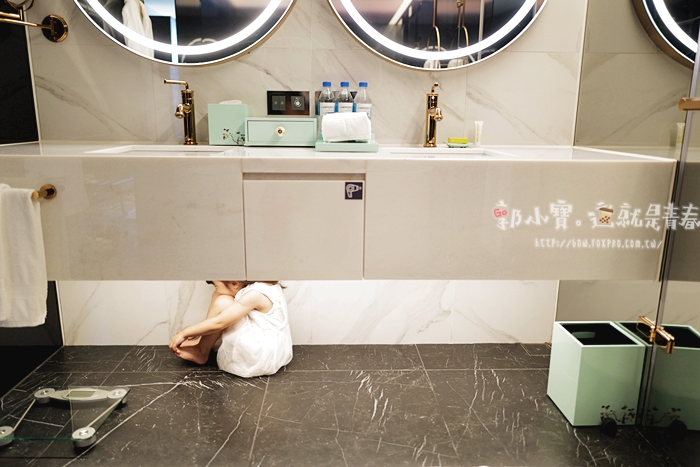 | 梳洗檯面是雙盆雙鏡設計,早上起床刷牙不用爭先恐後,台面也很大,可以放女生的保養品跟隱形眼鏡盒等物品,浴缸沒有加大,就是一般的浴缸尺寸,但是泡澡也夠用了。 |