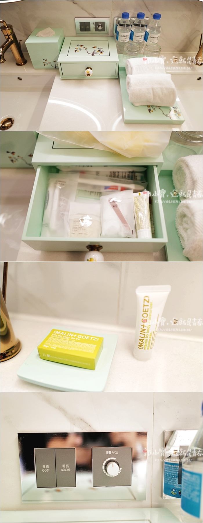 | 毛巾盤、面紙盒、備品盒是女生喜歡的湖水綠,備品相當齊全,牙膏是高露潔的,牙刷也滿好刷的,另外有提供盒妝香皂跟乳液,旁邊還有燈光控制鑑。 |