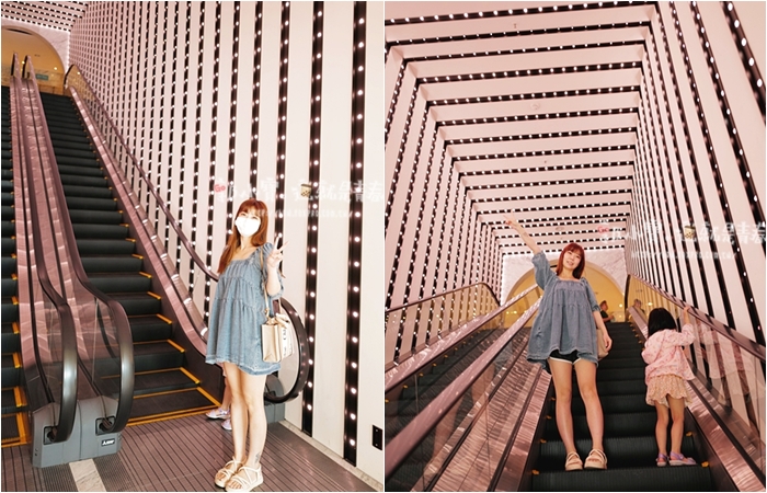 | 通往二樓的手扶梯彷彿進入時光隧道,二樓主要是李方艾美的自助餐廳,早餐就是在二樓用餐,這網美電梯也是很多人在這邊打卡。 |