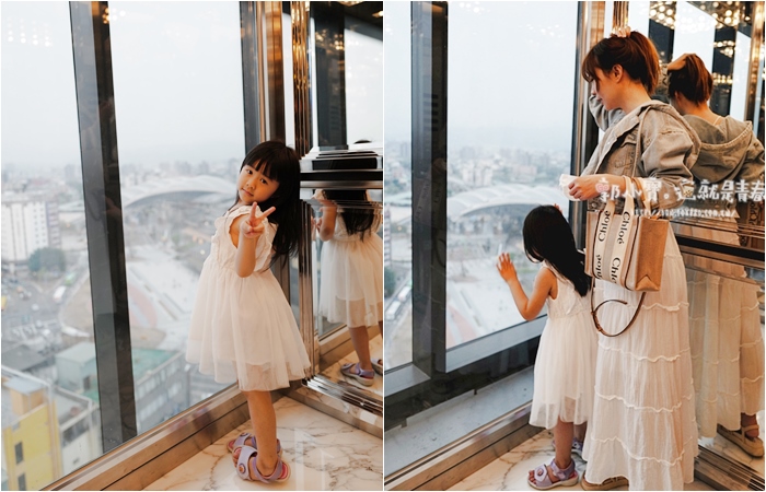 | 吃完樂美再去大廳喝杯咖啡,剛好三點可以領房卡入住,記得搭乘面窗的景觀電梯,可以將台中市景盡收眼底,達到高樓的時候,太妃嚇得雙腳發抖,小朋友倒是樂的很。 |