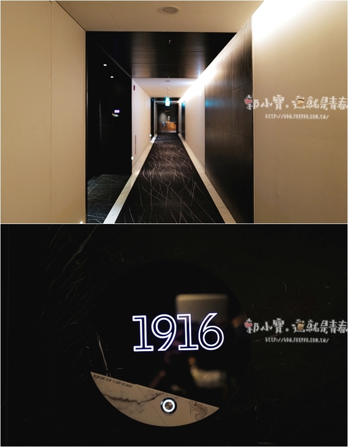 | 房間走道即使兩個人並肩而過也有足夠的空間,地上鋪的是長毛地毯,踩起來也滿舒服的,每隔一段會使用異材質拼接呈現出時尚感,門牌號碼有一個小巧思,底下一排小小的數字是代表經緯度。 |