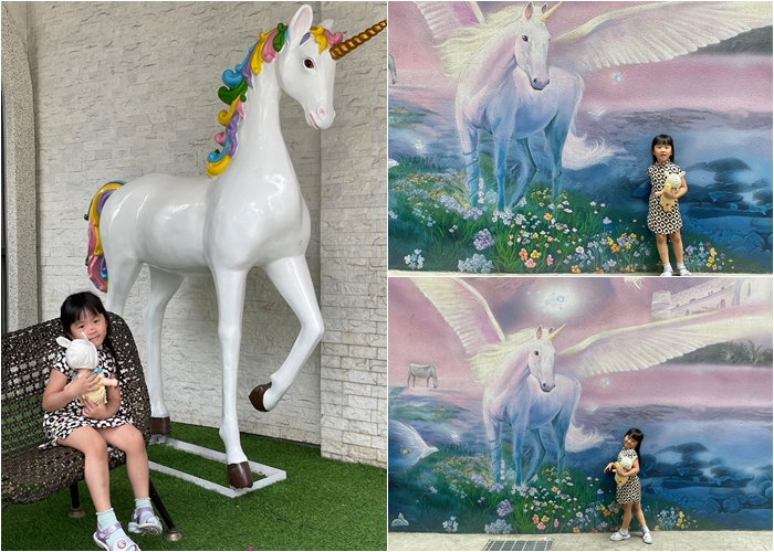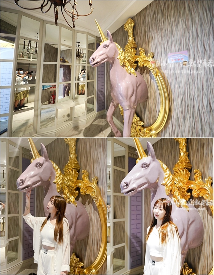 | 主題房的部分都是前身汽車旅館的車庫房重新裝潢改造的,我們訂到的是其中一間最夯的童話城堡套房,停好車上搭乘電梯上到2樓,一打開電梯門就可以看到金碧輝煌的獨角獸佈置物,門口玄關就那麼網美,難怪一堆人搶著訂房。 |