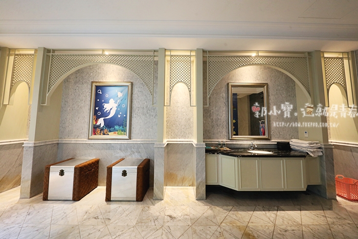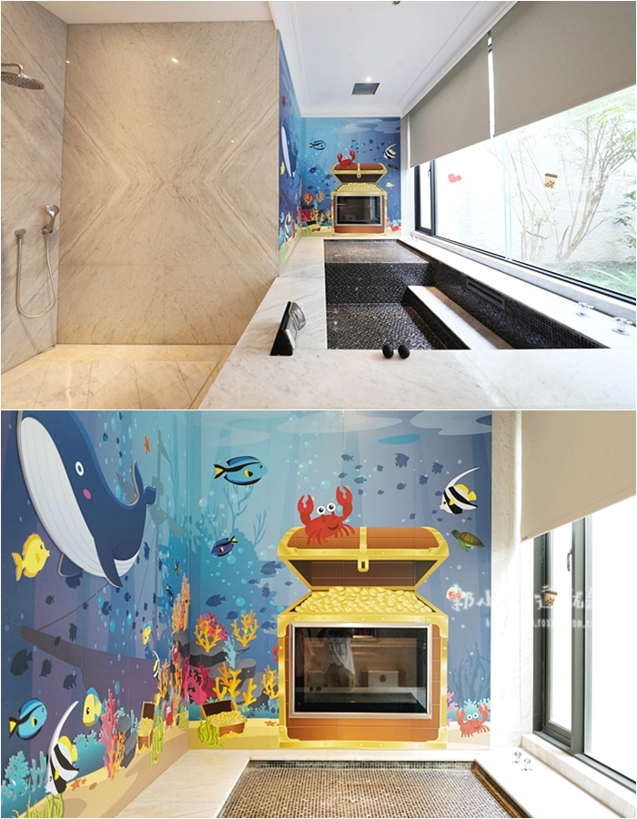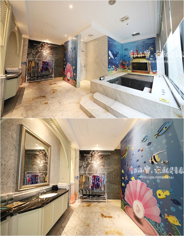 | 童話城堡套房除了白雪公主可以COS以外,千萬別忘記浴室還有美人魚可以COS,一打開浴室的大門就被這超大的浴室空間嚇傻,這空間真的也太大太豪華,都可以感覺在這邊奔跑了,全石造砌疊出來的浴室超級大氣。 |
