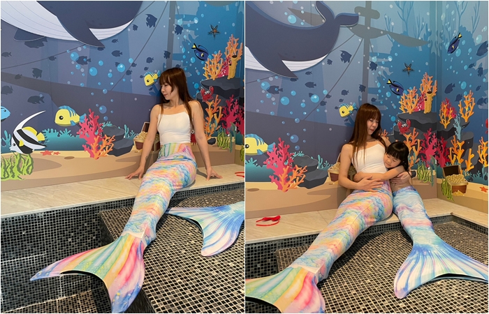 | 女兒根本捨不得把魚尾脫下來,不管去哪都要老爸抱著,只能抱著這一條美人魚去各個網美角落拍照了。 |