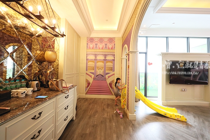 | 吃完早餐回到房間,女兒瘋狂的玩著溜滑梯,一邊溜一天不捨得離開,一直問我們可不可以再住一天,她還想當一天的公主,這房間的魔力真的太可怕了XDDD |
