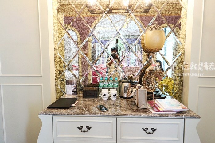 | 房門左邊一整個金碧輝煌,仔細一看才知道是置物檯,這置物檯也太豪華,還有以前汽車旅館的影子,但是確實也是屬於公主風格。 |