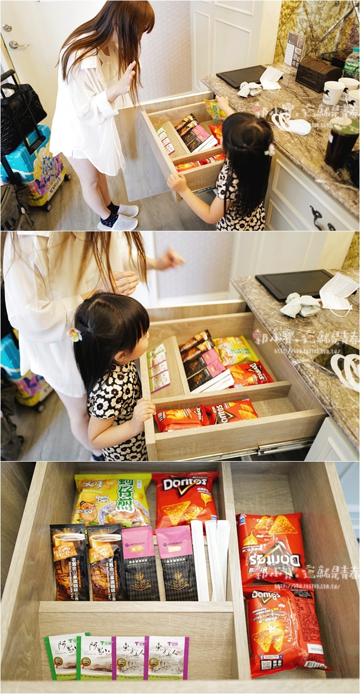 | 打開抽屜一看,是母女倆最愛的多款零食跟咖啡、飲料包,這一間房間屬於四人房,所以都是四人份,抽屜打開沒有什麼奇怪的味道。 |