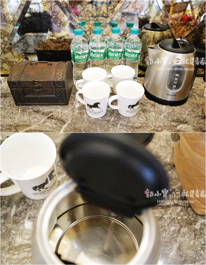| 檯面上放置著礦泉水跟杯子,另外還有一個電子煮水壺,打開壺蓋仔細一看,還刷洗的滿乾淨的。 |