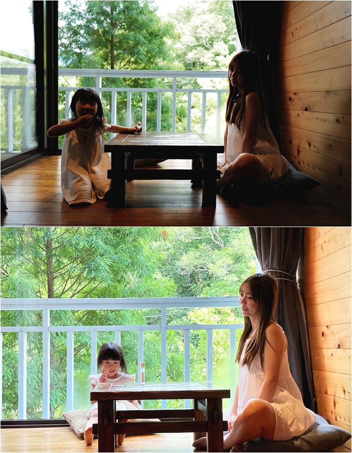 | 旁邊還有一個觀景平台我們一家三口都喜歡的,晚上吃宵夜跟女兒玩玩具都可以在這邊,我們夫妻兩下午還在這邊吃點心泡咖啡喝茶,好不愜意,重點是外面的景觀是綠油油的植被,整個度假感滿滿。 |