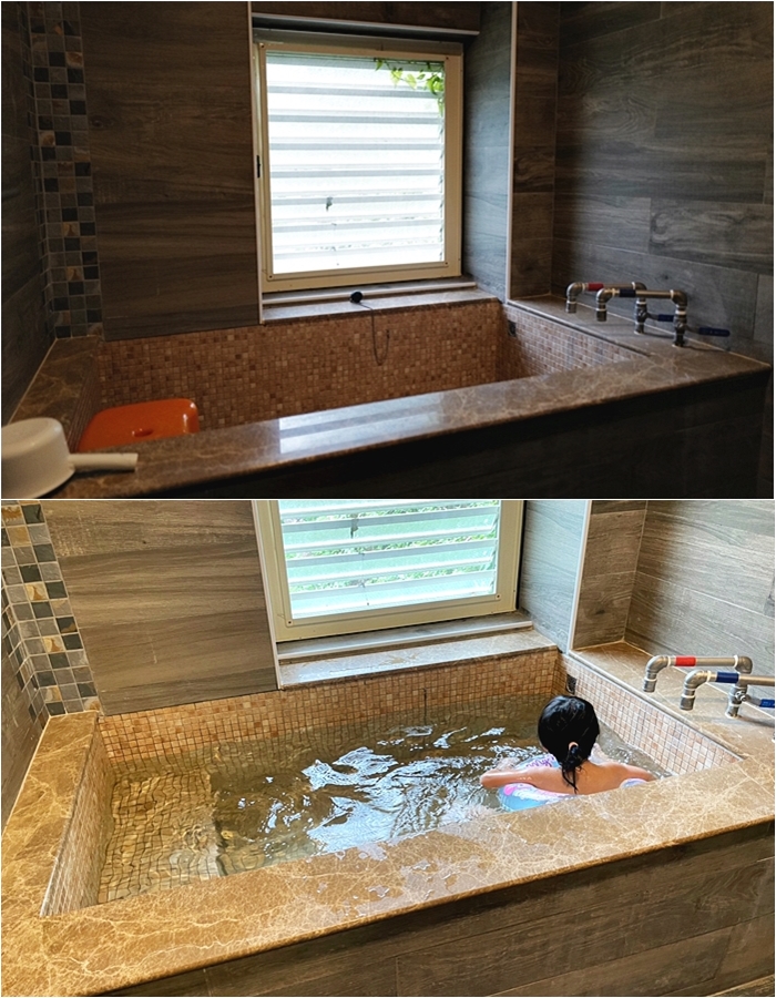 | 來這邊當然一天要洗很多次澡,提供一個超大的浴池,放出來熱水就是溫泉水,溫泉屬於美人湯,水質滑嫩,洗完後全身肌膚都滑滑的,女兒也直接在這邊玩起水來,晚上我們也泡了好幾輪溫泉,非常舒服呢!!! |