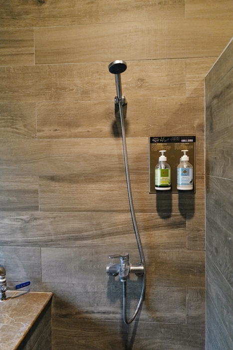 | 浴池旁邊就是蓮蓬頭,洗沐用品都是採取環保的補充式沐浴用品。 |
