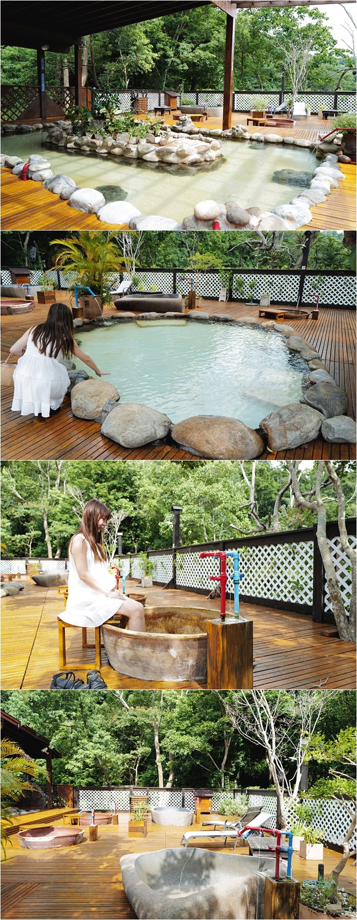 | 湖畔花時間的溫泉浴池的造型非常多樣,除了有露天大浴池以外,還有瓦罐行的個人泡湯池,各式各樣的浴池都很吸引人,不過天氣真的太熱了,所以我們拍拍照就閃人了,這邊小黑蚊滿多的,建議擦防蚊液。 |