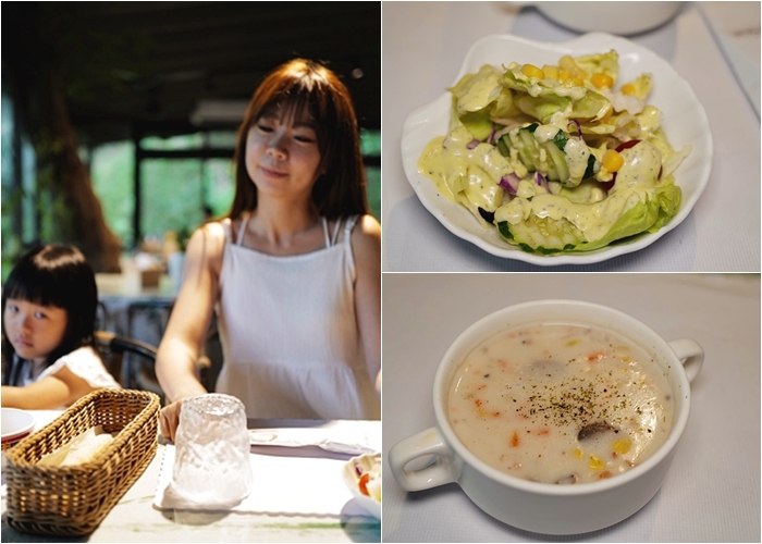 | 套餐有生菜沙拉跟濃湯,它們家的玉米濃湯喝起來還滿濃的,味道比較像是奶粉泡的奶味,但是非常濃郁。 |
