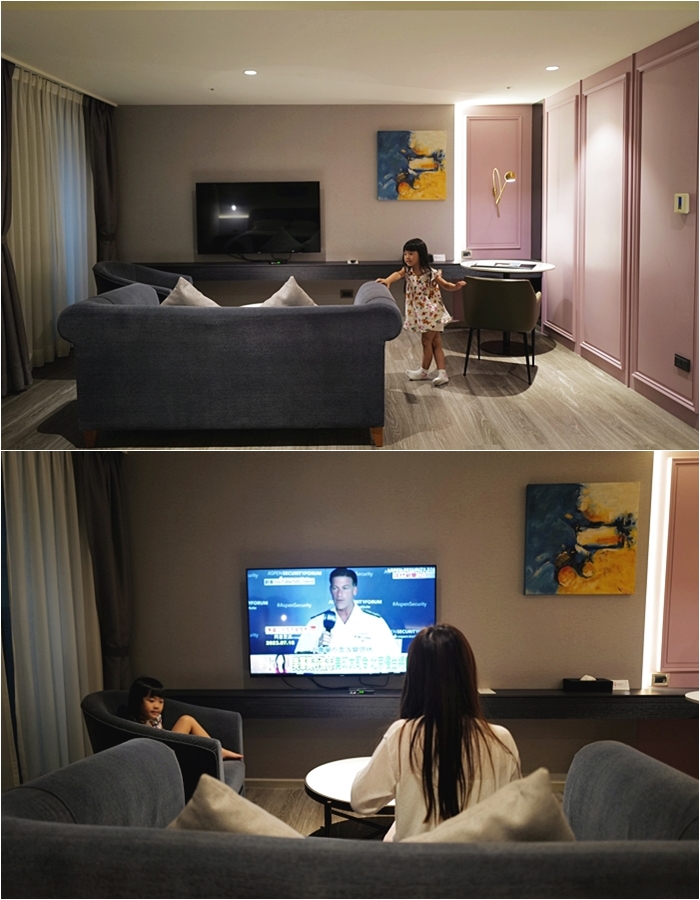 | 還有一個客廳就是家庭房的特色,除了有足夠的空間可以整理行李以外,沙發也都是選擇包覆性較強的沙發,房間壁面同樣採用色彩拼接的交錯感呈現出新一代的設計。 |