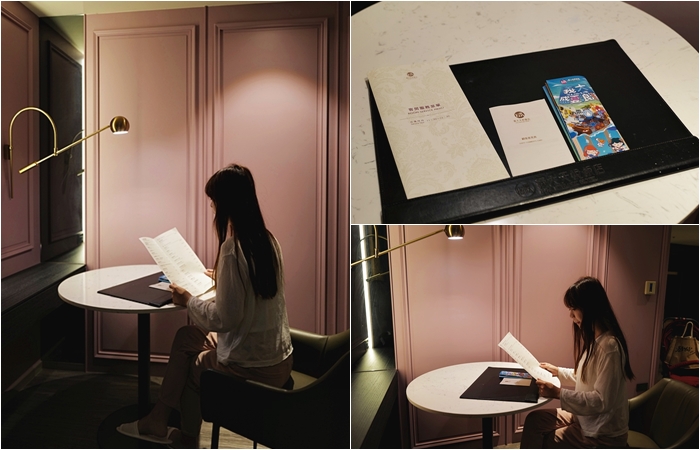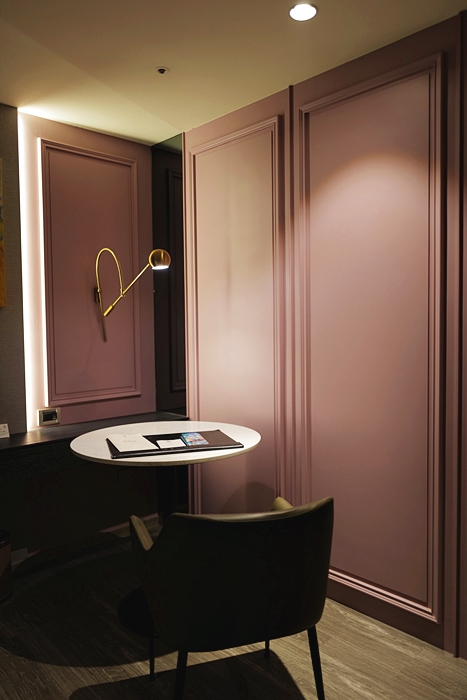 | 灰米壁布拼接粉紅色線板我真的覺得很不錯,獨立的小圓桌加上金色壁掛吊燈,顯得很有時尚感。 |