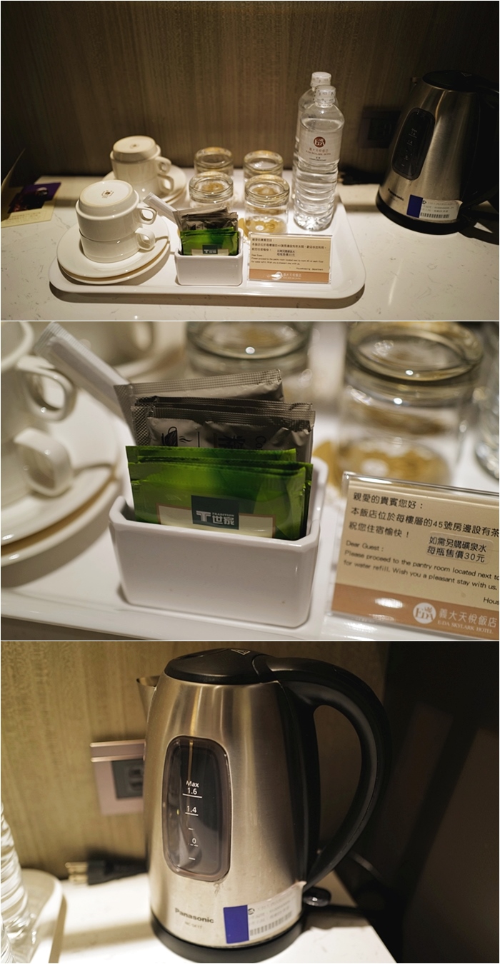 | 礦泉水、茶包、杯盤組一應具全,電熱水壺容量滿大的,翻開蓋子檢查一下,裡面清洗的滿乾淨的,礦泉水喝完可以到茶水間裝熱水。 |