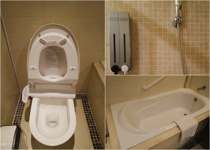 | 馬桶是免治馬桶,浴缸大小也適中,沐浴用品則是採用現在環保主題的壁掛可補充的沐浴用品。 |