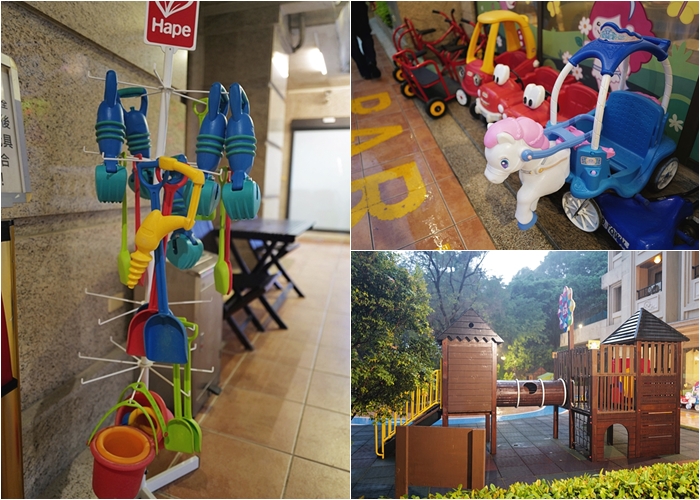 | 戶外遊戲區也提供了每個器材所需要的,沙坑的挖沙工具跟超多可愛的小車車,非常貼心,家長不用在自備挖沙工具,但是早上人潮多可能還要搶一下,畢竟這邊的小孩真的無敵暴多。 |