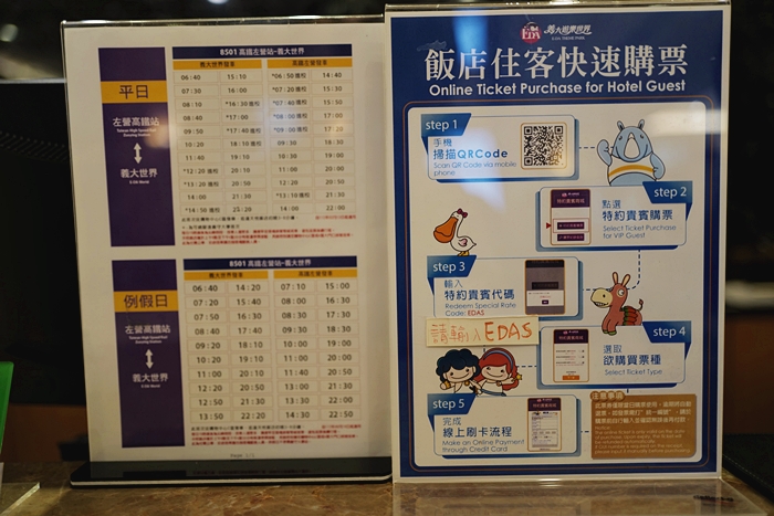 | 櫃檯上也有可以直接快速購票立招,還有巡迴巴士的時間表,天悅飯店還提供每天9:00會有往佛光山的免費接駁車可以搭乘(座位有限請先預約喔) |