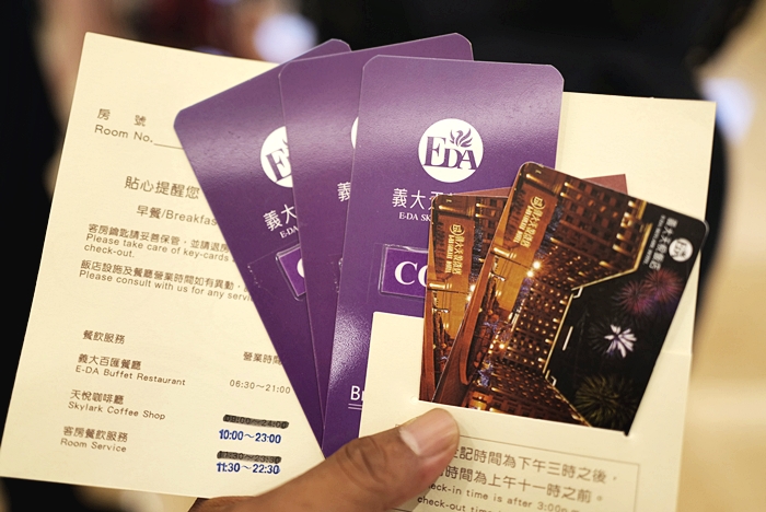 | 到手天悅飯店的房卡跟早餐卡,它們家的早餐卡模式我也是第一次看到,還滿顯眼的,我老婆一直以為它們給了好多房卡XD |