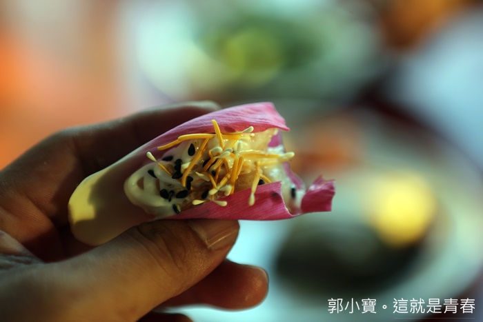 | 荷花瓣水果沙拉,直接拿起花瓣一塊吃,吃起來非常的爽口,頗讓我驚艷,這不太像25歲小女生會做出來的東西,不只有想法還有實力。 |