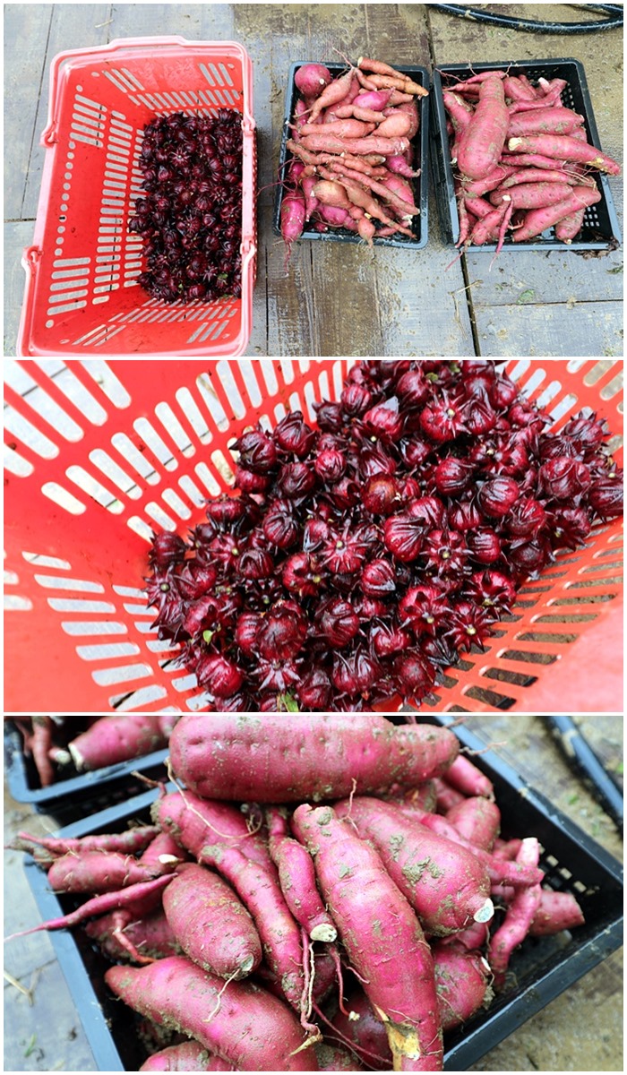 | 我們把挖好的地瓜跟洛神都洗好放置一旁,這些都是我們要帶回家的伴手禮啦,如果帶回家沒有在幾天內吃完的話就很建議不用洗,挖出來的時候連著泥土一起包進報紙裡面在用塑膠袋綁起來放在常溫處,這次會撐得比較久唷! |