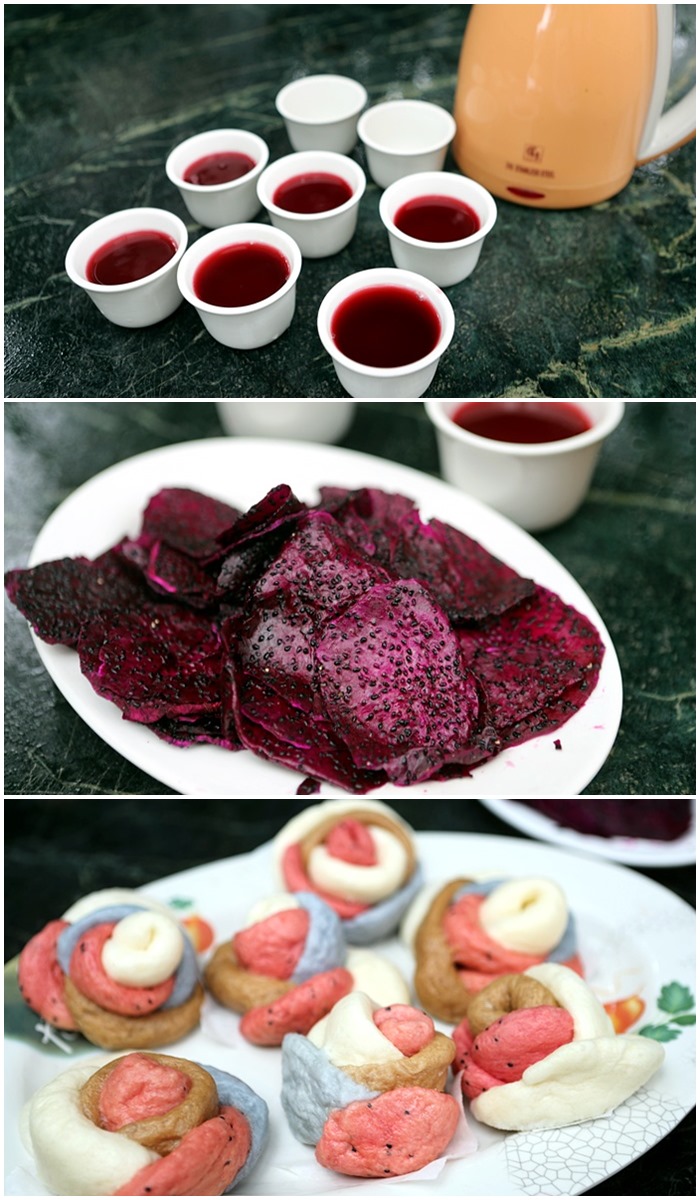 | 民宿主人的女兒更是多才多藝,本身是學習烘培出身,泡了一壺熱熱的洛神花茶給我們大家品嘗,非常濃郁的洛神花茶好好喝以外,她自己烘的火龍果乾更是讓人驚豔,瞬間一整盤就被我們嗑完了,還有這邊也有花瓣饅頭的體驗課程,看看這一顆顆的饅頭是不是超美的,每一顆顏色都很繽紛,但是都是使用天然的果汁或是蔬菜入色,吃起來鬆綿入口非常好吃,一口洛神茶一口饅頭真的很享受。 |