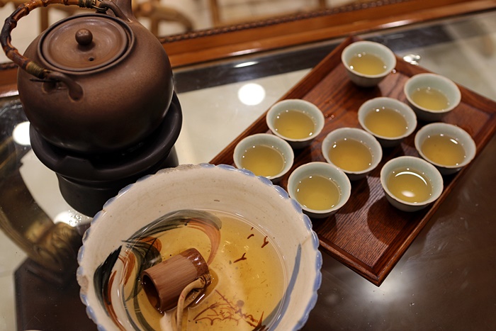 | 我們大夥待在客廳聊天還滿開心的,廚師在廚房裡準備午餐給我們,因為真的非常費工,上餐桌前還備有熱茶給我們一邊喝茶一邊聊天,非常有意思的喝茶,先將茶倒入骨董碗裡面,再用勺子將茶湯撈出至茶杯。 |