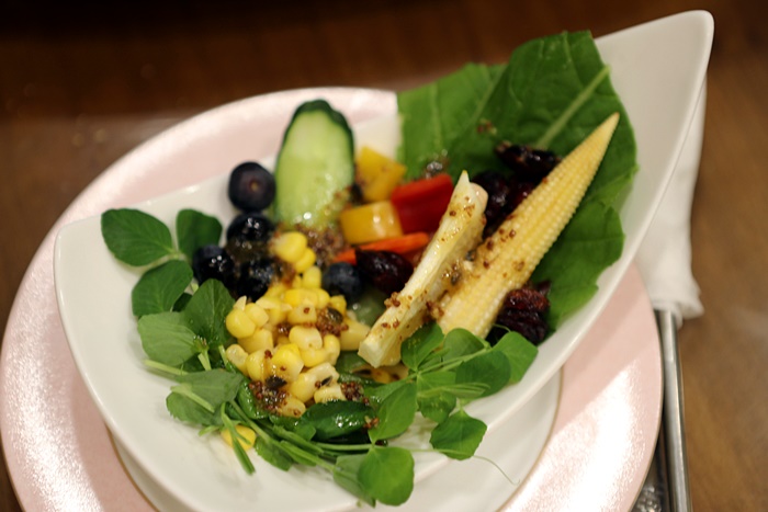 非常爽口的一道前菜,使用番茄、柳丁水果提升甜度以外還佐以小黃瓜、豆苗、萵苣等蔬菜讓口感更加豐富,主廚特調的百香果醬讓整體的香氣提升更多,用自然的百香果酸讓前菜沙拉的酸甜滋味搭配得剛剛好。 |
