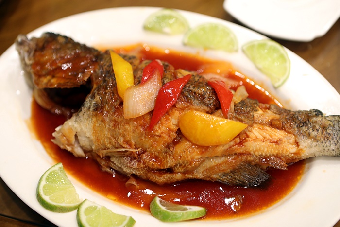桃園大溪在地養殖的鱸魚,主廚說這一桌子上的任何食材都是取自於桃園在地的農魚水產,就連鱸魚也是特別跟大溪的養殖業者訂購,搭配大園在地蜂農調配出來的蜂蜜與蜂蜜醋,魚肉的口感非常好,吃起來不會鬆散,搭配甜而不膩的蜂蜜做成紅燒超美味的。 |